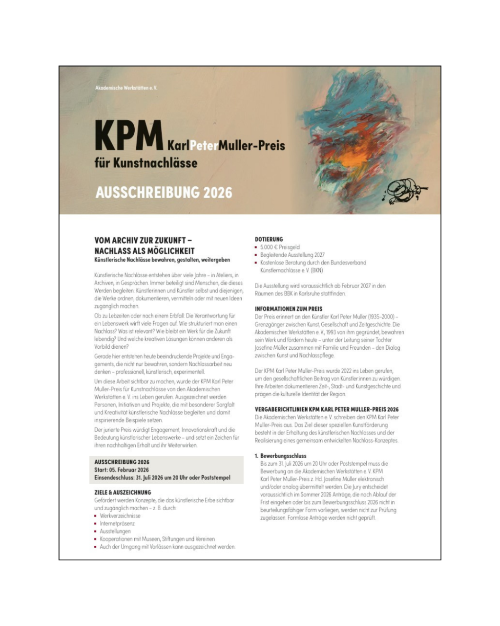 Ankündigung und Ausschreibung des KPM Karl Peter Muller Preises für Kunstnachlässe 2026. um 17.00 Uhr anschließender Live-Event „Schreddern oder sichern? – Sie entscheiden!“