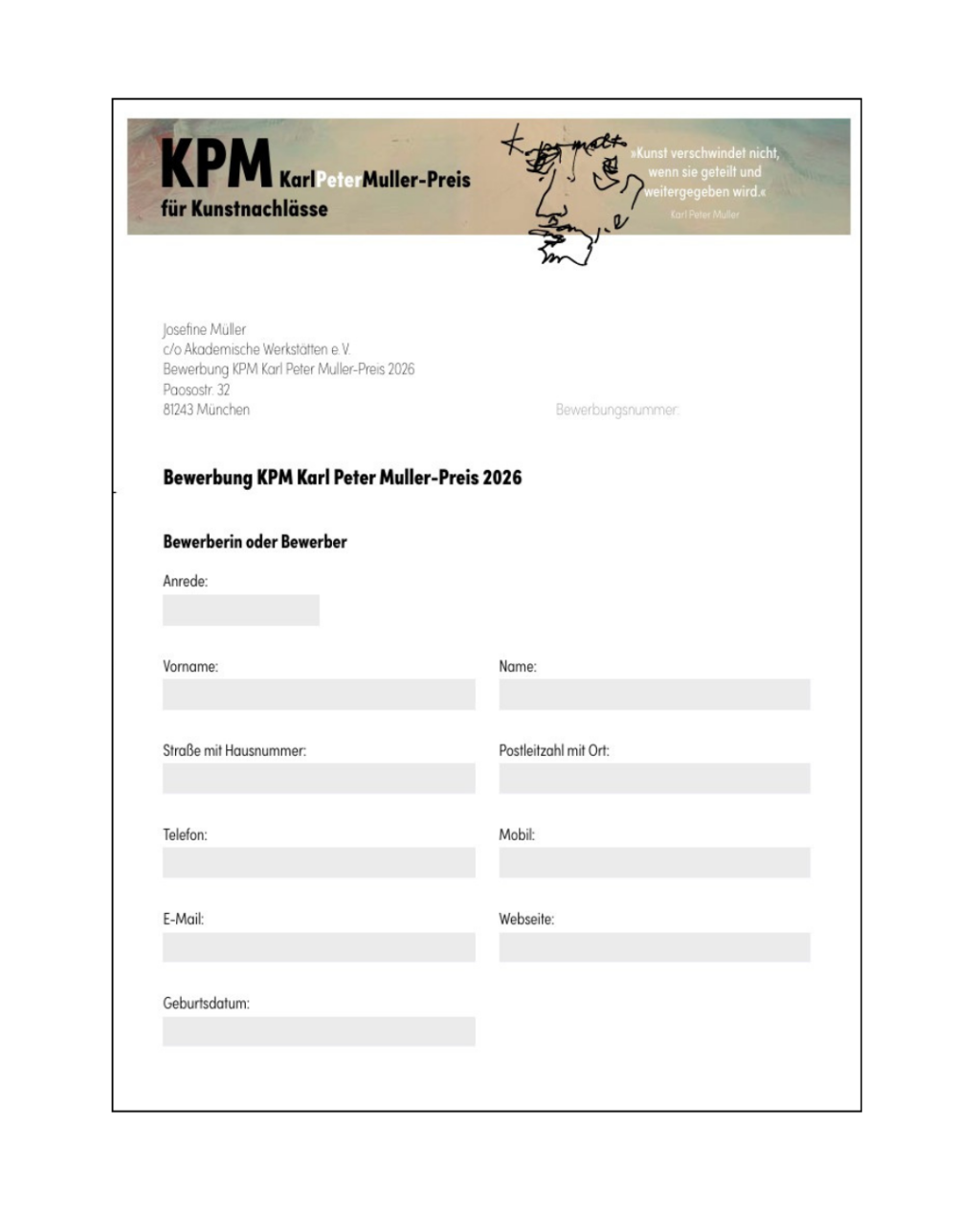 Karl Peter Muller (1935–2000) – ein Grenzgänger zwischen Kunst, Gesellschaft und Zeitgeschichte. Der nach ihm benannte Preis würdigt sein Vermächtnis. Die von ihm 1993 gegründeten Akademischen Werkstätten e. V. bewahren sein Werk und fördern heute – unter der Leitung seiner Tochter Josefine Müller sowie Familie und Freunden – den Dialog zwischen Kunst und Nachlasspflege.